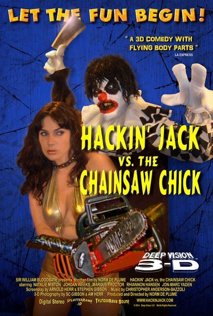 According to Deep Vision Publicity director Hy Gordon, “When the chainsaws roar in Hackin’ Jack vs. The Chainsaw Chick 3D, you’ll not only see the gushy red splatter spewing out of the screen… you get to feel it too!”