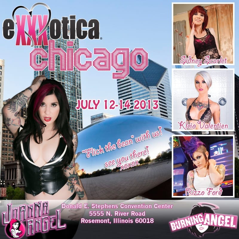 Los Angeles, CA/July 9, 2013 – Alt porn megastar Joanna Angel and the lovely ladies of BurningAngel will be partying with fans at the 2013 EXXXOTICA Chicago. Fans can rock out with their favorite BurningAngel from Sidney Scarlet(@SidneyScarlet), Kleio Valentien(@KleioValentien), Rizzo Ford(@RizzoFord) and, of course, the master of ceremonies, Joanna Angel (@JoannaAngel)! BurningAngel will be located at booth 1203 and the confab will be held at the Donald E. Stephens Convention Center in Rosemont, IL from July 12-14, 2013.