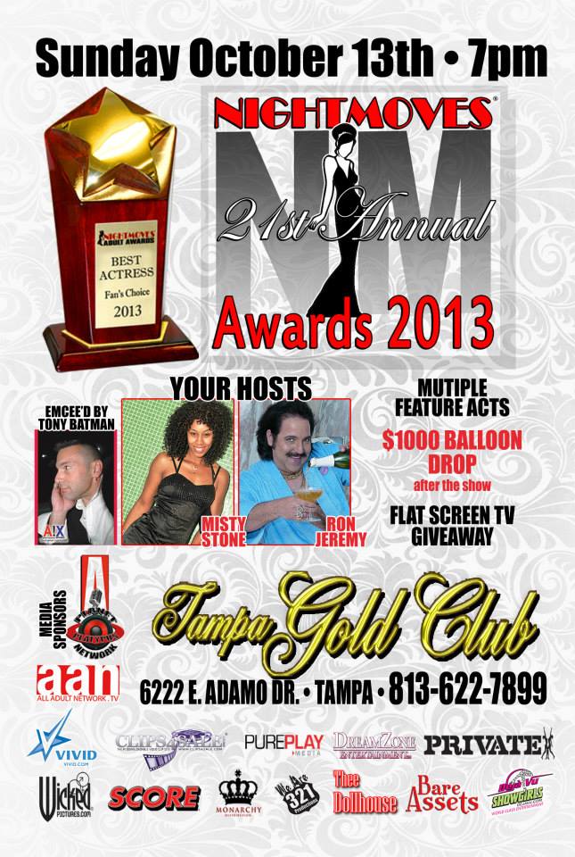 The NightMoves® Awards, started in 1993, is the third oldest, continuously running, adult awards show in the United States, trailing only the AVN Awards and the XRCO Awards. 2013 marks the 21st Annual NightMoves® Show, with adult super-star Ron Jeremy having hosted every single show. The NightMoves® Awards were the first to allow fans to select the winners, making it the original Fan Based Awards, as well as the first awards show to allow on-line voting. The NightMoves® Awards are more than just a one-night awards show; it is a fun-filled, exciting, ultra-busy weekend that includes “Star Caravan” events at local night clubs and multiple radio appearances, in addition to Fan Fest, where stars sign autographs and take photos. The list of stars who won their first-ever award from NightMoves® reads like a who’s-who in the adult entertainment world. Jenna Jameson won her first ever award (Best New Starlet) in 1995; Tera Patrick (2000), Gina Lynn (2002), Jesse Jane (2003), Sunny Lane (2005), Bree Olson (2007), Alexis Texas (2008), and Chanel Preston (2010), are just a few of the names on this prestigious list. The NightMoves® Awards, an offshoot of NightMoves® Magazine, is owned and operated by Paul & Tracy Allen and based in Tampa Bay, Florida. For more information, visit http://www.nightmoves-online.com/awards-show.html, follow them on Twitter at http://twitter.com/NightMovesShow, or on Facebook at https://www.facebook.com/pages/NightMoves-Magazine-Online/143346985716326.