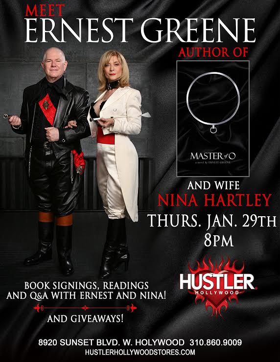 LOS ANGELES, CA, January 12, 2015 – Erotic author and filmmaker Ernest Greene, author of Master of O, and pioneering film legend Nina Hartley will be on hand on Thursday, January 29th at HUSTLER HOLLYWOOD in West Hollywood for a reading of and a Q&A about Greene’s novel, Master of O. The event will begin at 8:00pm, and is free to the public.