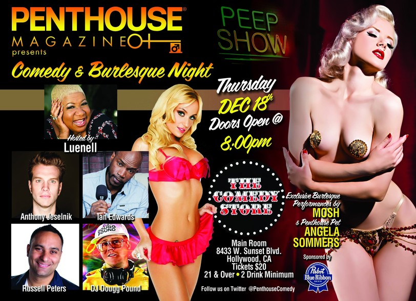 LOS ANGELES, CA/December 15, 2014 – Penthouse Magazine will play host to Peep Show, a night of onstage entertainment, featuring stars of comedy, racy burlesque performers and Penthouse Pets, taking place in the main room of the world famous Comedy Store in West Hollywood, Thursday, December 18 at 8:00pm.